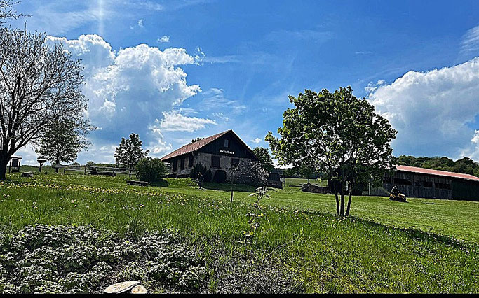 Strom, Wasser, Toilette, sogar eine Dusche gibt es in der Hütte, die unter dem Dach Übernachtungs-möglichkeiten bereithält. Draußen lässt es sich herrlich sitzen, toben und spielen. Platz ist genügend da, ebenso ein neuer Spielplatz im keltischen Stil, der im Auftrag des Rhönforums entstanden ist. Neben der Wanderhütte selbst gibt es eine Festscheune. Als offener Stall waren hier einst Kühe untergebracht. Heute ist es ein geschlossenes Gebäude, mit Theke und Bühne für zirka 120 Personen.